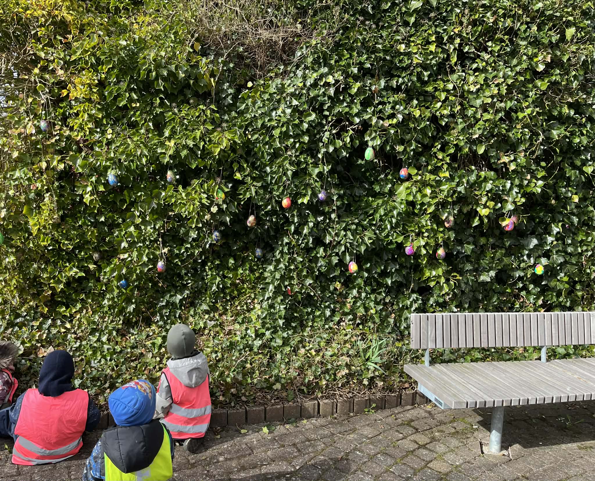 Dét her er suseme hyggeligt: Vuggestuen og børnehaven har arbejdet med emnet “påske” de seneste 2 uger. De har bl.a. malet påskeæg, som de i dag har placeret ved Laksespringvandet. De hænger der nu – og vi håber de er der indtil efter weekenden, så en masse lokale kan gå forbi og nyde synet af de fine kreationer.